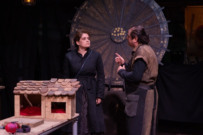 A cenografia, concebida por Leo Prieto em parceria com Gabriela Rossi Kohn, tem papel central nessa construção. A oficina feita de madeiras, serras e ferramentas não se limita a ser suporte visual; é, ela mesma, dramaturgia. Cada peça de madeira carrega a marca da transformação possível, cada instrumento sugere um gesto ainda por vir. O cenário é uma metáfora da condição humana: matéria instável, sujeita ao corte e à emenda, aberta ao risco da invenção. Essa leitura se confirma na forma como os atores interagem com o espaço, tornando-o um interlocutor ativo. A iluminação de Ari Nagô amplia esse campo simbólico. Ela revelar, organiza tensões, nos apresenta à gata Sybilla, mas sempre precisa e sutil, como um gato. Os momentos de claridade plena são raros e carregam a força de uma exposição súbita; as sombras, ao contrário, ocupam o palco como lembrança do que não se mostra. Esse jogo de luz e escuridão dá ao espetáculo um ritmo silencioso, como se o tempo fosse regido por respirações e suspensões.